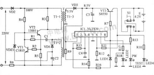 該電路主要由一塊軟塑封集成塊IC1(YLT539)和三極管VT3等組成。從變壓器T的1-3繞組感應(yīng)出的交流電壓5.5V經(jīng)二極管VD3整流、電容C3濾波后,輸出一個(gè)直流8.5V左右電壓(空載時(shí)),該電壓一部分加到三極管VT3的e極;另一部分送到軟塑封集成塊IC1(YLT539)的1腳,為其提供工作電源。集成塊IC1有了工作電源后開始啟動(dòng)工作,在其8腳輸出低電平充電脈沖,使三極管VT3導(dǎo)通,直流8.5V電壓開始向電池E充電。