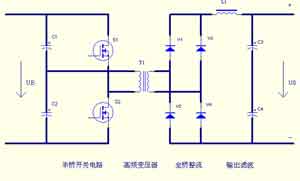 DC/DC功率變換器采用半橋電路拓?fù)洌β势骷?,控制簡單,可靠性高。如圖5所示,采用MOSFET和IGBT并聯(lián)技術(shù),充分利用了MOSFET開關(guān)速度快和IGBT導(dǎo)通壓降低的優(yōu)點。在電路上采取措施,使得MOSFET的關(guān)斷時間比IGBT延遲一定的時間,大大減小了IGBT的電流拖尾,降低了開關(guān)通態(tài)損耗,提高了效率和可靠性,使得半橋電路的輸出功率可以實現(xiàn)7kW。其輸出側(cè)采用的整流方式有半波整流,中心抽頭全波整流及全橋整流。由于輸出電壓較高,全橋整流對變壓器利用率高,比較適合用于這種場合。