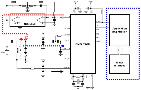 藍(lán)色箭頭表示接收路徑。變壓器從電力線耦合過來的信號(hào)經(jīng)AMIS-49587內(nèi)置放大器構(gòu)成的低通濾波器由內(nèi)部ARM進(jìn)行FSK解調(diào)分析。圖中黑色箭頭是50Hz的過零檢測信號(hào)引腳。系統(tǒng)依靠這個(gè)信號(hào)進(jìn)行同步定時(shí)。圖中藍(lán)色虛線內(nèi)是電表內(nèi)的應(yīng)用處理器,負(fù)責(zé)應(yīng)用層處理通信及計(jì)量?! ?br />