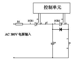 控制原理是:首先通過380V交流電給C1充電,正半周SCR1導通,完成充電過程,負半周SCR1自動截止,C1電壓一直保持到下一個正半周期信號到來。此時開通SCR2,使C1、L1形成回路,產(chǎn)生自由震蕩并完成放電。如此反復循環(huán),即達到了理想的磁場波形。