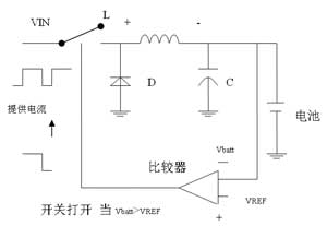 快速調節(jié)器的操作是通過控制一個晶體管開關的占空比來實現(xiàn)的。占空比會自動增加以使電池流入更多的電流。當VBATT<VREF時,一個比較器會將開關閉合(參見圖5a),電流流入電池和電容C,這個電流同時也存儲在電感L中。VBATT持續(xù)升高,直到超過VREF,調節(jié)此時比較器將開關斷開(參見圖5b),存儲在電感中的電流迅速下降直到二極管偏置,使得電感電流以減速度流入電池,電容C在電感電流衰減后開始放電。并且最后VBATT開始下降,當VBATT低于VREF時,比較器再次將開關閉合并開始另一次循環(huán)。在較大的范圍內如果減小占空縮短閉合的時間,平均電壓就會下降,反之亦然。因此可以通過控制占空比的方法調節(jié)電壓或電流至所需要的值。