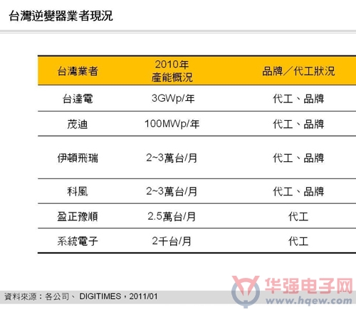 DIGITIMES Research預(yù)估,大陸業(yè)者受惠于大陸內(nèi)需市場,2011年出貨量將持續(xù)攀升,目前大陸的逆變器品質(zhì)與國際逆變器相比雖有落差,但長遠來說,大陸業(yè)者可通過在當(dāng)?shù)厥袌龅膽?yīng)用,不斷調(diào)整改進產(chǎn)品性能,將產(chǎn)品提升到一定程度后再打入國際市場。