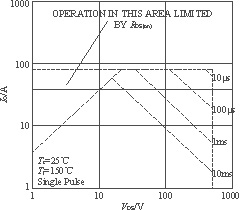 檢測(cè)電纜絕緣中,通常需要的直流電壓為50V,這樣,設(shè)定中性點(diǎn)的接地電阻最小值為5Ω,通過歐姆定律我們可以得出,直流電源至少要能夠提供10A的電流;此外,考慮到在測(cè)量過程中需要的開關(guān)速度,就可以選擇合適的電力電子器件了。經(jīng)過對(duì)常用全控型電力電子器件的考察,我們決定采用MOSFET來(lái)作為開關(guān)器件,選用IR公司的IRFP460。IRFP460是IR公司生產(chǎn)的高速器件,它的安全工作區(qū)如圖2所示,在圖2中我們可以看出,在50V的情況下,10A是它可以安全關(guān)斷的電流[3]。