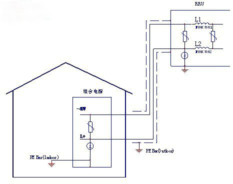 注:① 如果組合電源內(nèi)部沒有配置合適的直流防雷器,則應(yīng)該在RRU電源線引出機房處加裝一級直流防雷箱;