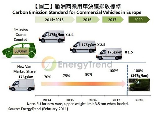 電動(dòng)車(chē)在歐洲將有重大突破,根據(jù)集邦科技(TRENDFORCE)旗下研究部門(mén)EnergyTrend的調(diào)查,歐洲國(guó)會(huì)通過(guò)了最新的商用車(chē)排放標(biāo)準(zhǔn)決議,低排放車(chē)輛將成為未來(lái)車(chē)廠必然發(fā)展的趨勢(shì),因此即使2011年鋰電池有供過(guò)于求的壓力,但是根據(jù)集邦科技的觀察,隨著車(chē)輛排放標(biāo)準(zhǔn)逐漸明確化,汽車(chē)廠為了替2014年低排放車(chē)輛上市做準(zhǔn)備,將使得鋰電池短缺情形再次上演。