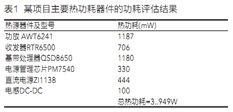 終端平臺的熱源器件主要有基帶芯片、射頻芯片、功放、電源管理芯片等,這些器件的功耗有的可以從廠商給的datasheet中查到,有的查不到,對于從datasheet中查不到功耗數(shù)據(jù)的熱源器件,需要根據(jù)經驗或同類項目的測試數(shù)據(jù)進行估算,還可以直接向平臺提供商索取相關數(shù)據(jù)。表1為某項目主要熱功耗器件的功耗評估結果。