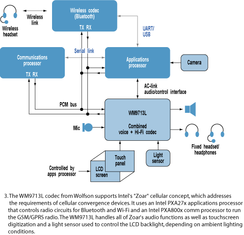 蘇格蘭的Wolfson微電子公司從事硬件音頻編碼解碼器的制造,該公司新產(chǎn)品開發(fā)部的副總裁PeterFrith指出,給手機(jī)加入回放MP3的功能,或者用于下載音樂,或者作為高質(zhì)量的鈴聲,意味著用戶已經(jīng)希望在手機(jī)中看到一個(gè)相對高保真的回放系統(tǒng)。因此,手機(jī)制造商目前期盼出現(xiàn)功耗甚至更低的便攜式DAC,且能夠達(dá)到100dB的信噪比。