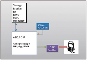 便攜式音頻系統(tǒng)——有些手持式音頻系統(tǒng)采用ASIC,有些則采用DSP。MP3、Ogg和其他媒體文件等音頻內(nèi)容通常存儲在高密度存儲設(shè)備中,如NAND閃存、安全數(shù)字(SD)卡、多媒體卡(MMC)和安全數(shù)字高容量卡(SDHC)等。
