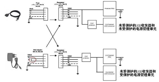 在連接個人計算機(PC)等標準USB源設(shè)備時,連接器上將包含Vbus電源端子和數(shù)據(jù)端子(D+和D-)。Vbus電壓值由USB規(guī)范明 確定義:額定電壓為5V,最高可達5.25V。事實上,較長的線纜會因串連電感產(chǎn)生振鈴現(xiàn)象。這個最大振鈴紋波電壓取決于移動設(shè)備的輸入電容和寄生電感。 售后非原配件往往具有較低的性能,電纜也會有較高的寄生參數(shù),這些因素對連接的外設(shè)可能造成潛在危害。