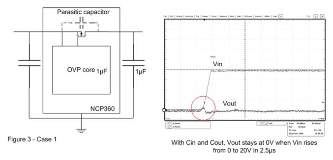 在圖3的案例2中,輸出電容已被移除。這樣,當OVP器件輸入端出現(xiàn)快速輸入瞬態(tài)現(xiàn)象時,旁路元件將保持開路。這時可以在輸出端觀察到過 沖,這個過沖可能會損壞連接至OVP輸出端的電子元器件。為了解決這個問題,必須在輸出引腳上連接一個輸出電容,并盡量靠近OVP器件擺放。