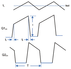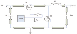 此概念可以推廣到所有利用梯形波形進(jìn)行電路設(shè)計的場合,不過本文僅討論電源設(shè)計。參考圖4中的交流模型,研究其回路電流流動情況:起點為輸入電容器,然后在Q1導(dǎo)通期間流向Q1,再通過L1進(jìn)入輸出電容器,最后返回輸入電容器中。