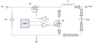 當(dāng)Q1關(guān)斷、Q2導(dǎo)通時,就形成了第二個回路。之后存儲在L1內(nèi)的能量流經(jīng)輸出電容器和Q2,如圖5所示。這些回路面積控制對于降低電磁干擾是很重要的,在PCB走線布線時就要預(yù)先考慮清器件的布局問題。當(dāng)然,回路面積能做到多小也是有實際限制的。