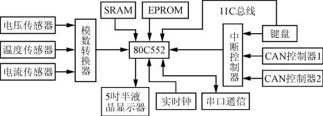 系統(tǒng)的主要功能包括數(shù)據(jù)采集、電量估計(jì)及顯示診斷等。由于80C552具有8路10位A/D轉(zhuǎn)換的功能,因此,采集模塊先采用線性光耦法測量單電池的電壓,通過其4個(gè)A/D口將模擬量轉(zhuǎn)換為數(shù)字量存入存儲(chǔ)器,溫度測量采用單總線技術(shù),使用Dallas數(shù)字芯片來測量溫度,該芯片具有12位的精度等級(jí),能非常準(zhǔn)確地測量到系統(tǒng)的溫度??傠妷?、電流信號(hào)通過特殊的傳感器將其信號(hào)轉(zhuǎn)換為0~10V的信號(hào),通過14位的A/D轉(zhuǎn)換器件轉(zhuǎn)換為數(shù)字量存入系統(tǒng)。