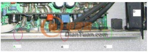 攝氏25度環(huán)境時,輸出滿載1000W,10分鐘后圖片B處(8個MOS管的中心位置)的溫度比A處高出6~8度!C處(綠圈)最低,比B處低14~15度!(C處為進風口,D為風扇,樣機為進風設計,據(jù)說是用以延長含油軸承的壽命),同樣型號并聯(lián)工作的功率MOS管,實際工作的溫差那么大,自然對“均流”是極其不利!所以可靠性不高就不足為怪了。