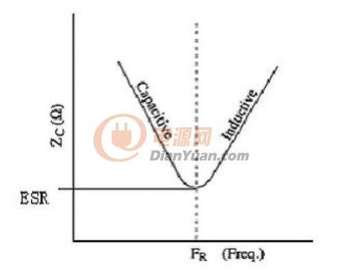 從上圖,我們很清楚的看出:電容在整個頻段,并非都是表現(xiàn)為電容的特性,而是在低頻的情況(諧振頻率以下),表現(xiàn)為電容性的器件,而當(dāng)頻率增加(超過諧振頻率)的時候,它漸漸的表現(xiàn)為電感性的器件。也就是說它的阻抗隨著頻率的增加先減小后增大,等效阻抗的最小值發(fā)生在串聯(lián)諧振頻率時,這時候,電容的容抗和感抗正好抵消,表現(xiàn)為阻抗大小恰好等于寄生串聯(lián)電阻ESR。