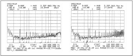 圖1–帶共模扼流圈的零電流開關轉換器(圖左)和帶濾波器的脈寬調制轉換器(圖右)的傳導輸入噪聲頻譜。