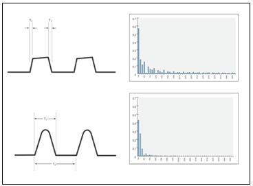 圖3–PWM(上圖)和零電流開關(下圖)的電流波形和頻譜。注:波形并不按比例繪制。