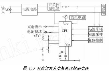 分段恒流充電智能化控制電路如圖(3)所示。該電路采用 CPU 控制,可對充電電池和充電環(huán)境溫度進(jìn)行檢測,對電池充電進(jìn)行計時,采用充電過程中電池的電壓和電流,對分段恒流充電過程進(jìn)行控制。