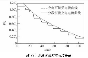 其次,分段恒流充電智能化控制技術(shù)通過減小各段恒流值下降梯度(分段數(shù)增加),可使實(shí)際充電電流曲線更接近充電可接受電流曲線。通過試驗(yàn)確定該型電池初次恒流值I(1),并減小階段恒流充電的電流下降幅度。如果降低充電電流后,達(dá)到充電終止容量梯度值的時間很短 (設(shè)定一個最小充電時間),則適當(dāng)增大電流下降的幅度。分段恒流充電電流曲線如圖(4)所示。