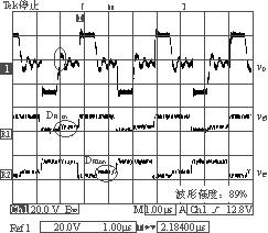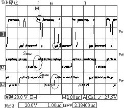 IM-CDR結(jié)構(gòu)選擇如圖1(c)所示的拓?fù)?。從結(jié)構(gòu)上可以看出,磁芯的3個(gè)磁柱上都加了相同的氣隙(lg),這必然會(huì)導(dǎo)致變壓器原邊的漏感(Lk)的增大,但可以利用變壓器原邊漏感中的能量實(shí)現(xiàn)副邊同步整流管的自驅(qū)動(dòng)(開(kāi)通),同步管的關(guān)斷是通過(guò)外加驅(qū)動(dòng)信號(hào)來(lái)完成的。實(shí)驗(yàn)電路如圖2所示,由圖2可以看到副邊同步管的驅(qū)動(dòng)電路包括一個(gè)繞組(Na),兩個(gè)二極管(Da1,Da2)和兩個(gè)MOS管(Sa1,Sa2),它的實(shí)現(xiàn)比較簡(jiǎn)單,只需要在磁芯的中心磁柱上多加一組繞組即可。變壓器原邊采用的是對(duì)稱半橋拓?fù)洹?shí)驗(yàn)電路的具體參數(shù)見(jiàn)表1所列。實(shí)驗(yàn)波形圖如圖3和圖4所示。圖3是在負(fù)載電流Io=4A時(shí)測(cè)得的變壓器原邊電壓波形以及兩個(gè)同步整流管的門極驅(qū)動(dòng)電壓波形圖。由于此時(shí)的負(fù)載電流較小,反映到變壓器原邊的激磁電流也較小,在原邊開(kāi)關(guān)管關(guān)斷的瞬間,變壓器原邊漏感(Lk)與開(kāi)關(guān)管輸出結(jié)電容(Co1,Co2)間的振蕩尖峰不夠高,不足以開(kāi)通副邊的同步整流管。