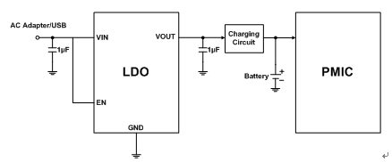 但在標(biāo)準(zhǔn)的諾基亞適配器中,有很大一部分適配器的輸出電壓是高于7V的,圖3是諾基亞適配器AC-3C的輸出特性曲線,從圖中可以看出,AC-3C的輸出電壓在空載時為7.5V,而有的諾基亞充電器的輸出電壓會高達8~9V。為了適應(yīng)諾基亞適配器,曾有如圖5所示的用高壓LDO設(shè)計的手機充電系統(tǒng)方案: