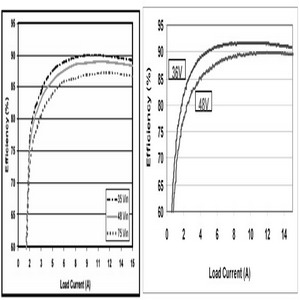 Maxim電源部制作了一款基于MAX5051的隔離電源模塊,圖2是詳細(xì)的電氣原理圖。我們將該電源模塊與市場(chǎng)上流行的電流模式同步整流推挽電源模塊(這里我們稱其為非定制模塊)進(jìn)行了比較,從所測(cè)試的效率曲線(圖3)可以看出,基于MAX5051的模塊效率明顯提高。輕載時(shí),比如1A輸出負(fù)載,MAX5051模塊電源的效率大于62%,而非定制模塊的效率則小于58%。在輸出功率為半載時(shí)(7.5A),MAX5051模塊效率為92%,非定制模塊效率是88%。滿功率負(fù)載時(shí),MAX5051模塊電源的效率仍比非定制模塊效率高出4%。從效率曲線對(duì)比,可以得出雙管正激電路能夠更好的滿足模塊電源高效率的要求。