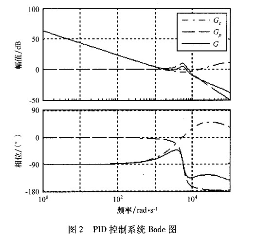 圖2所示為PID控制系統(tǒng)的開環(huán)頻率特性圖(Bode圖)。其中,G0為被控對象;G 為PID控制器;G=Gp×G0