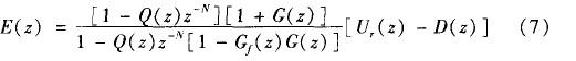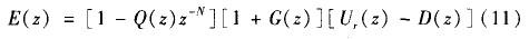Q(z)、Gf(z)為低通濾波補償器,是重復控制器設(shè)計工作的重點。P(z)的作用是將開環(huán)增益調(diào)節(jié)至很大的有限值,在不影響穩(wěn)態(tài)精度的前提下保證系統(tǒng)穩(wěn)定性;Gc(z)的作用是通過限制重復控制器的頻帶范圍來提高系統(tǒng)的魯棒性 。由圖可得到系統(tǒng)的誤差傳遞函數(shù)為: