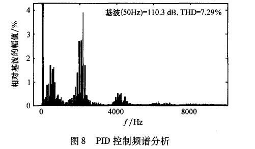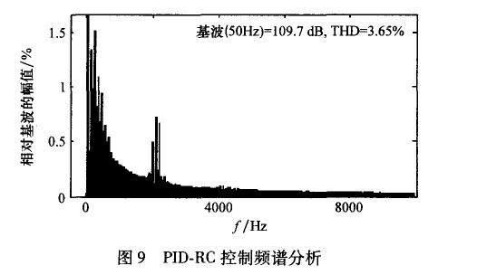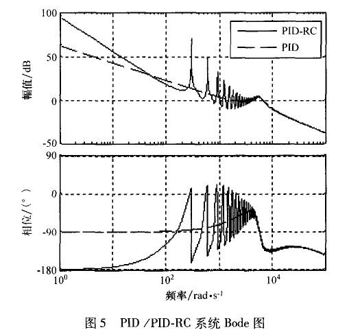 在高頻段,開環(huán)增益變得非常小,這對抑制高頻噪聲,提高系統(tǒng)穩(wěn)定性和魯棒性是非常有幫助的。但是,在非諧波頻率處,沒有嵌入重復控制器的系統(tǒng)開環(huán)增益更大一些,這說明重復控制器對位于該頻率的信號控制效果較差。因此,PID控制器在系統(tǒng)中除了有提高系統(tǒng)動態(tài)響應(yīng)速度的作用外,還要調(diào)節(jié)非諧波信號,彌補重復控制器的不足。