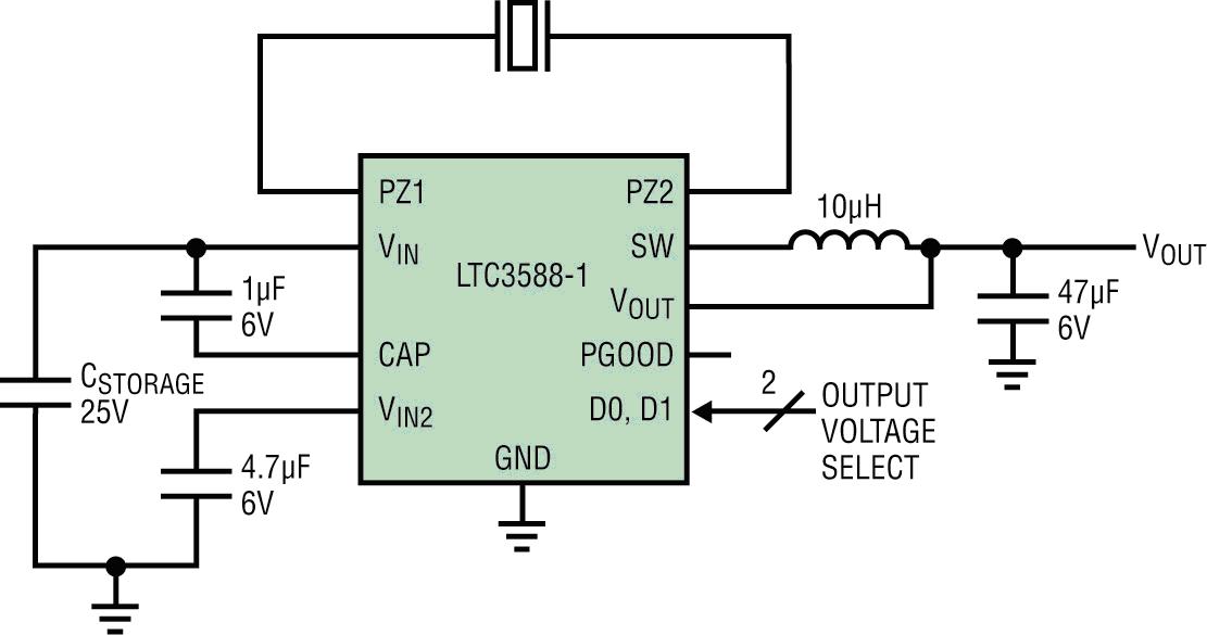 LTC3588-1 是一款完整的能量收集解決方案,專為包括壓電式換能器在內(nèi)的低能量源而優(yōu)化。壓電器件通過(guò)器件的擠壓或撓曲產(chǎn)生能量。視其尺寸和構(gòu)造的不同,這些壓電元件能產(chǎn)生幾百 μW/cm2 的功率。