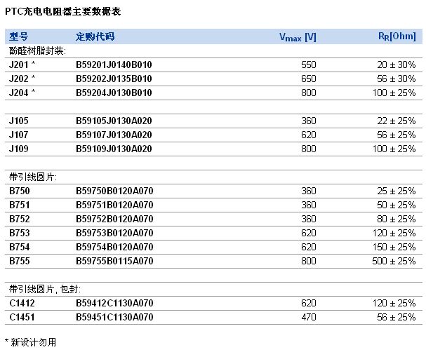 普通電阻在電容充電時常用來限制電流。不過,這常有技術(shù)風(fēng)險。舉例來說,當(dāng)短接電容器時,如果電容器短路或者繼電器失靈,電阻器將持續(xù)暴露在大功率電平下。這可能導(dǎo)致電阻器或者整個系統(tǒng)遭到破壞。愛普科斯采用基于PTC陶瓷的新式J20X系列充電電阻器,現(xiàn)已研發(fā)出一種專業(yè)解決方案:在自我防護的同時,還實現(xiàn)了相對緊湊的尺寸。如下表所示,J20X系列包括J201、J202和J204產(chǎn)品。