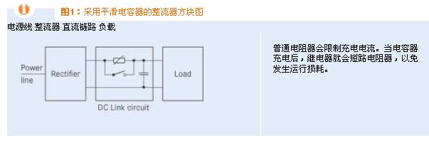 當(dāng)電容器充電時,通常需要串聯(lián)一個電阻器來限制充電電流,以免產(chǎn)生超過允許范圍的強電流峰值。一般是采用固定式普通電阻或負(fù)溫度系數(shù)(NTC)電阻實現(xiàn)這一功能。在大多數(shù)情況下,會在充電之后使用一個由時間或電壓控制的繼電器來短接限流元件。充電電流的制約對整流器和轉(zhuǎn)換器系統(tǒng)來說非常重要,因為產(chǎn)生的沖擊電流峰值如果未得到限制,可能會觸發(fā)熔絲或使整流器遭受超過允許范圍的強電流。圖1所示為傳統(tǒng)整流器或轉(zhuǎn)換器系統(tǒng)的方塊圖。