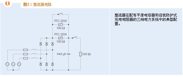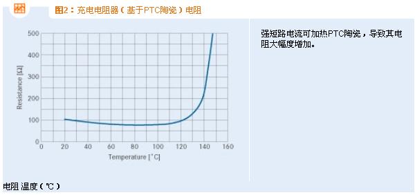 為處理典型故障,比如電容器短路或短路開關(guān)失靈,建議使用J20X系列自我防護式充電電阻器。在無故障充電中,這些元件的作用就像固定式普通電阻器,可制約充電電流的峰值。當(dāng)發(fā)生故障時,PTC陶瓷的溫度和內(nèi)阻將隨加大的歐姆損耗一同增加(見圖2),并將電流限定在安全級別。