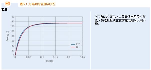 在短時間內(nèi),并聯(lián)的兩個自我防護式充電電阻器與外界達到熱平衡,同時由于PTC陶瓷的高電阻值,吸收的能量僅有略微上升。最終產(chǎn)生的能量吸收與圖7所示類似。