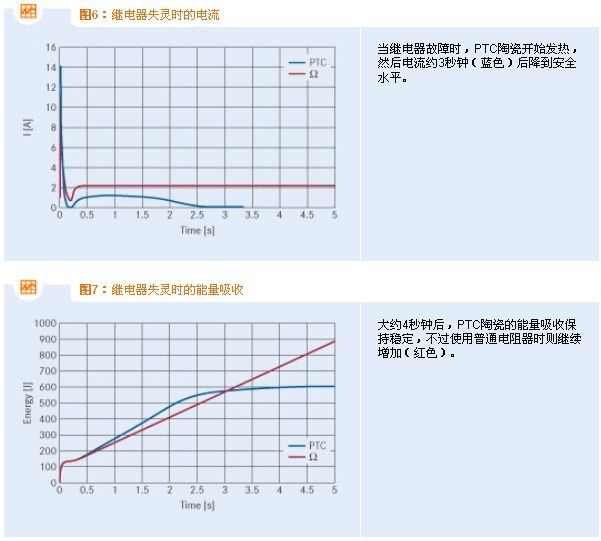 當(dāng)發(fā)生故障時,PTC熱敏電阻用作限流元件的優(yōu)勢就會十分明顯。如果繼電器接通失敗,負(fù)荷電流將流經(jīng)充電電阻器,并產(chǎn)生強大的熱應(yīng)力,這要求電阻器有相應(yīng)的尺寸。若采用基于PTC陶瓷的充電電阻器,其電阻會由于強大的起始功率損耗而升至數(shù)10 k,從而能夠在故障發(fā)生期間限定電流(參見圖6)。在約三秒之后,先流經(jīng)兩電阻器然后流經(jīng)總體電路的電流已跌至數(shù)10 mA。有關(guān)吸取能量的比較,請參見圖7。