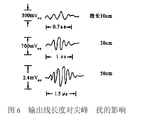 為減小輸出線上的損耗和尖峰干擾,輸出到負載的連線應短。圖6畫出了對三種不同長度的輸出線,當負載電流為8A時,在負載端所測得的干擾波形。輸出線長,尖峰干擾的幅度大、寬度也寬。相同長度的輸出線,線徑粗則尖峰干擾幅度大、寬度寬。用雙絞線能有效地衰減電磁感應電勢,表1說明對感應電勢衰減的數(shù)值隨扭距變短而增大。