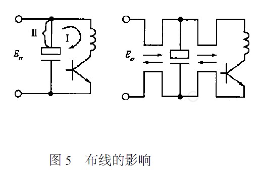 流過開關大電流的導線應盡量短,并且不跟其它線交連。降壓型開關穩(wěn)壓電源的續(xù)流二極管或者升壓型的開關三極管的接地端應以最短的引線直接與輸出電容的地端相連。圖5表示了布線的影響,尖峰干擾通過環(huán)路I輻射,故構成這一環(huán)路的各段連線的感性耦合必須最小,電容器的引線要短,以減小引線電感。