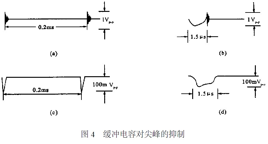 在開關三極管的CE之間,或者在續(xù)流二極管的兩端并聯(lián)RC緩沖電路可使尖峰干擾明顯減小。圖3中,三極管T關斷時,集電極電壓上升,通過D和R1對C充電,使其上升速率變緩,選擇充電常數(shù)CR1的值可以控制上升速率。T導通時,D截止,C對R1和R2放電,限制了導通瞬間的峰值電流。該緩沖電路改變了負載線的形狀,減少了開關三極管的損耗。在續(xù)流二極管兩端并上RC電路也同樣有效。圖3中,當用3DD11和2CK120C時,可并0.022LF左右的電容器(f=2kHz),該電容的容量有一最佳值,它的作用可以從圖4看出。圖4(a)是不加C的情況,將其在時間軸上放大后為圖4(b)。并上緩沖電容后分別見圖4(c)和(d)。