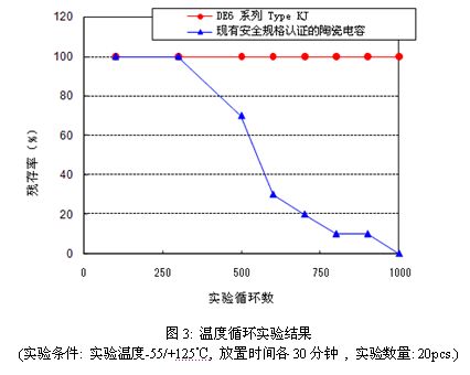 現(xiàn)有安全規(guī)格認(rèn)證的陶瓷電容器在溫度循環(huán)實(shí)驗(yàn)等反復(fù)進(jìn)行溫度變化的條件下,因電容器構(gòu)成材料熱膨脹率的散差,容易引起外部涂裝樹脂的結(jié)合力降低,從而導(dǎo)致外部涂裝樹脂出現(xiàn)裂縫,嚴(yán)重時(shí)會(huì)由于內(nèi)部陶瓷元器件的裂縫,造成容值及絕緣耐壓值的降低。所以,原樣采用現(xiàn)有結(jié)構(gòu)材料將難以用于車載設(shè)備。因此,為提高耐溫度循環(huán)性,通過(guò)選定具備可塑性的新型樹脂材料,就能夠制做出確保溫度循環(huán)1000周期、符合安全規(guī)格認(rèn)證的陶瓷電容器。溫度循環(huán)實(shí)驗(yàn)下的產(chǎn)品特性比較情況如圖3所示。