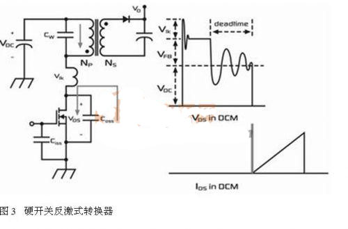 圖3示出傳統(tǒng)硬開關(guān)反激式轉(zhuǎn)換器。在這種傳統(tǒng)的間斷模式反激式轉(zhuǎn)換器 (DCM) 的停滯時(shí)間期間,寄生電容將與VDC周圍的主要電感發(fā)生振蕩。寄生電容上的電壓會(huì)隨振蕩而變化,但始終具有相當(dāng)大的數(shù)值。當(dāng)下一個(gè)時(shí)鐘周期的MOSFET 導(dǎo)通時(shí)間開始時(shí),寄生電容 (COSS和CW) 會(huì)通過MOSFET放電,產(chǎn)生很大的電流尖峰。由于這個(gè)電流出現(xiàn)時(shí)MOSFET存在一個(gè)很大的電壓,該電流尖峰因此會(huì)做成開關(guān)損耗。此外,電流尖峰含有大量的諧波含量,從而產(chǎn)生EMI。[page]
