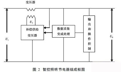 智控照明節(jié)電器主要由主變壓器、補(bǔ)償供給器、數(shù)據(jù)采集與編程處理、輸出和操作控制等四大部分組成(見(jiàn)圖2)。