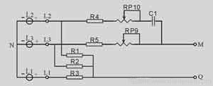 在保護(hù)器電源輸入端⑤、⑥、⑦串接相應(yīng)的RC移相電路(R4、RP9、C11、RP10、R5、R3)。調(diào)整相應(yīng)電位器RP9、RP10,使加至整流橋輸入端M、Q的電壓為確定值(在保護(hù)器工作電源處于額定電壓下進(jìn)行調(diào)整)。如工作電壓有波動(dòng),則由相應(yīng)RC移相電路使整流橋電壓輸入端電壓發(fā)生變化,從而使IC3A②端電壓Vcc也發(fā)生變化。在取樣電路中加入V1穩(wěn)壓管,則保證電壓檢測(cè)值不得超過V1穩(wěn)壓值。如超出,則IC3A中V③<V②,輸出①端為“0”,并使IC3B⑤端電平為“0”(C6經(jīng)R28放電,電平下降);同時(shí),IC3B輸入端V⑤<V⑥(V⑥電平由R24、R23分壓取得),輸出端⑦亦為“0”,使IC2⑥端電平為“0”,產(chǎn)品處于保護(hù)狀態(tài)。
