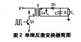 功率轉(zhuǎn)換部分采用單端反激電路,結(jié)構(gòu)如圖2。當(dāng)加到原邊主功率開(kāi)關(guān)管Q1的激勵(lì)脈沖為高電平使Q1導(dǎo)通時(shí),直流輸入電壓加在原邊繞組兩端,由于此時(shí)副邊繞組相位是上負(fù)下正,整流管D1反向偏置截止,原邊電感儲(chǔ)存能量;當(dāng)激勵(lì)脈沖為低電平使Q1截止時(shí),原邊繞組兩端電壓極性反向,副邊繞組相位變?yōu)樯险仑?fù),整流管正向偏置導(dǎo)通,變壓器儲(chǔ)存的能量向副邊釋放。在此開(kāi)關(guān)過(guò)程中,高頻變壓器既起變壓隔離作用,又起電感儲(chǔ)能作用。