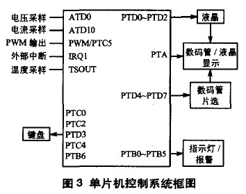 單片機(jī)采用Freescale公司的68HC908SR12,其內(nèi)部資源豐富,集成了12k的程序存儲(chǔ)器,2路定時(shí)/計(jì)數(shù)器,14通道1o位A/D轉(zhuǎn)換器,PWM輸出,內(nèi)部溫度傳感器等。單片機(jī)控制系統(tǒng)框圖如圖3。