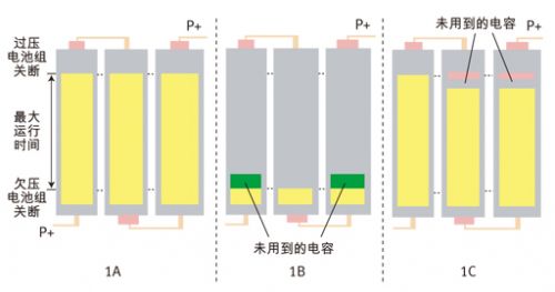 在鋰離子電池組中,存在一些允許每節(jié)串聯(lián)電池達(dá)到的預(yù)定義電壓最小值和最大值。這是一種由電池組中IC控制的安全特性,請(qǐng)參見(jiàn)圖1A。只要每一節(jié)電池均保持在過(guò)壓和欠壓斷開范圍之間,則該電池組便能夠放電和充電。如果一節(jié)電池達(dá)到上述任何一個(gè)閾值,則整個(gè)電池組便會(huì)關(guān)閉(欠壓),從而讓主機(jī)本應(yīng)可用的電池組處于無(wú)法充電狀態(tài)(請(qǐng)參見(jiàn)圖1B)。另外,它不允許充電器向電池組充入應(yīng)有的大量能量(請(qǐng)參見(jiàn)圖1C)(過(guò)壓)。
