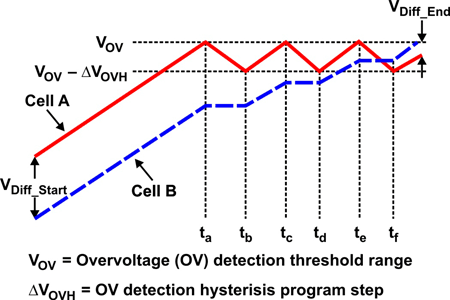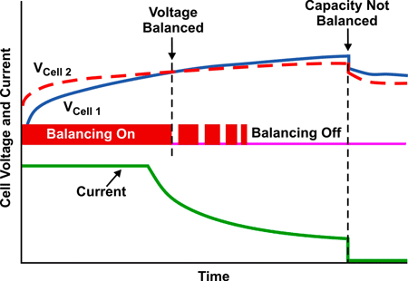 電池平衡算法只使用電壓發(fā)散作為平衡標(biāo)準(zhǔn),具有過(guò)平衡(或欠平衡)的缺點(diǎn),這是由于存在阻抗失衡影響(請(qǐng)參見(jiàn)圖3和圖4)。問(wèn)題是,電池阻抗還會(huì)在充電期間引起電壓差異(VDiff_Start和VDiff_End)。簡(jiǎn)單的電壓電池平衡并未區(qū)分是電量失衡還是阻抗失衡。因此,這種平衡不能保證完全充電后所有電池均獲得100%的電量。