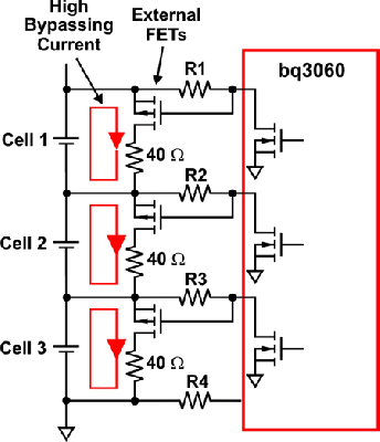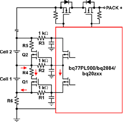 由于使用集成FET解決方案的無(wú)源電池平衡技術(shù)的平衡能力有限,因此電池差異或失衡率可能超過(guò)電池平衡。另外,由于存在低旁路電流,它可能會(huì)占用幾個(gè)周期來(lái)對(duì)一般失衡進(jìn)行校正。利用現(xiàn)有組件設(shè)計(jì)一些外部旁路電路可以增強(qiáng)電池平衡(請(qǐng)參見(jiàn)圖6和圖7)。在圖6中,當(dāng)決定對(duì)某節(jié)電池進(jìn)行平衡時(shí)內(nèi)部平衡MOSFET首先開啟。這便形成一條低電流通路,其通過(guò)連接電池端(電池1和電池2)及IC引腳的外部濾波器電阻。當(dāng)內(nèi)部FET柵-源電壓在電阻中形成,該外部MOSFET便被開啟。其缺點(diǎn)是,鄰近電池?zé)o法快速、同時(shí)獲得平衡。例如,如果鄰近內(nèi)部FET被開啟,則Q2不能被開啟,因?yàn)闆](méi)有通過(guò)R2的電流。