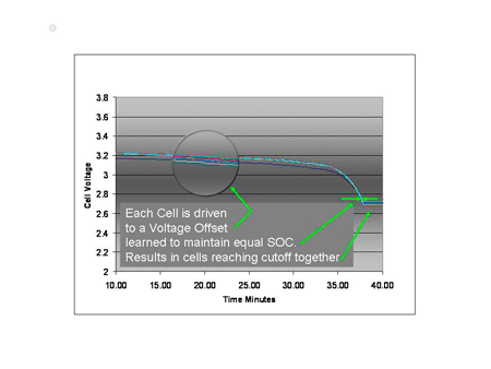 SOC抽取以一種同阻抗追蹤器件類似的方式工作,它計(jì)算出每一節(jié)電池的精確電荷電平,并在電池之間轉(zhuǎn)移能量,這樣電池電量在充電結(jié)束時(shí)(EOC)就實(shí)現(xiàn)了平衡(請(qǐng)參見(jiàn)圖9*)。觀察放電OCV圖(見(jiàn)圖10*),我們將每一節(jié)電池預(yù)平衡到一個(gè)反映其電量的失調(diào)電壓。幾個(gè)百分點(diǎn)的電量差異會(huì)使該放電曲線中下方出現(xiàn)巨大差異。如果我們已知1%到2%的電量,我們便可以在放電結(jié)束時(shí)擁有極為接近的匹配性。這就是在充電完成和放電結(jié)束時(shí),你想要利用有源平衡技術(shù)有效地讓電池獲得最佳平衡的區(qū)域。