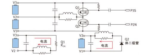 電池組設(shè)計(jì)人員設(shè)定串聯(lián)電池之間的失衡閾值。如果IC測(cè)量到超出該閾值的失衡,它就會(huì)啟用PowerPump。圖8顯示的是使用了兩個(gè)MOSFET(Q1和Q2)及一個(gè)功率電感的降壓升壓電路簡(jiǎn)圖。頂部電池(V3)需要將能量轉(zhuǎn)移至低位電池(V2),P3S信號(hào)(工作在約200kHz和30%占空比下)觸發(fā)該能量轉(zhuǎn)移,隨后能量通過(guò)Q1流至電感。當(dāng)P3S信號(hào)重置時(shí),Q1關(guān)閉,電感能量水平處在最高水平。因?yàn)殡姼须娏鞅仨毑粩嗔鲃?dòng),因此Q2的體二極管被正向偏置,從而完成向V2位置電池的電荷轉(zhuǎn)移。需要注意的是,由于其串聯(lián)電阻較低,存儲(chǔ)于該電感中的能量只有輕微的損耗。