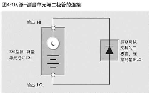 圖4-10 示出如何使用236型或6430型SMU來(lái)測(cè)量二極管的泄漏電流。236型SMU能夠以10fA的分辨率測(cè)量電流,并且輸出需要的偏置電壓。6430型SMU的分辨率為10aA。源-測(cè)量單元還可以測(cè)量其它的二極管參數(shù),包括正向電壓降和擊穿電壓。